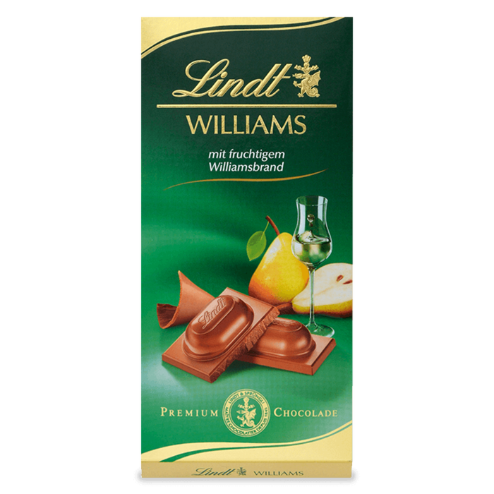Vollmilch-Schokolade mit Williams- Birnenbrand-Füllung (33%)